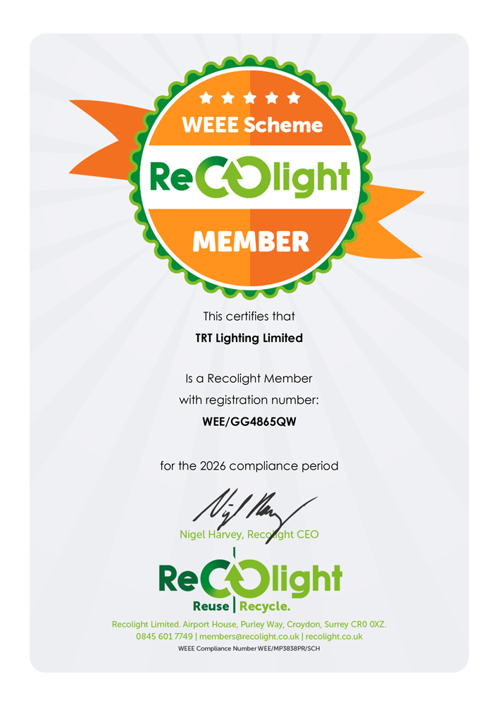 All luminaires supplied directly by TRT Lighting incorporate a WEEE levy charge to cover cost of disposal at end of life. TRT Lighting’s WEEE obligation is regulated, monitored and discharged by Recolight – Certificate No WEE/GG4865QW.